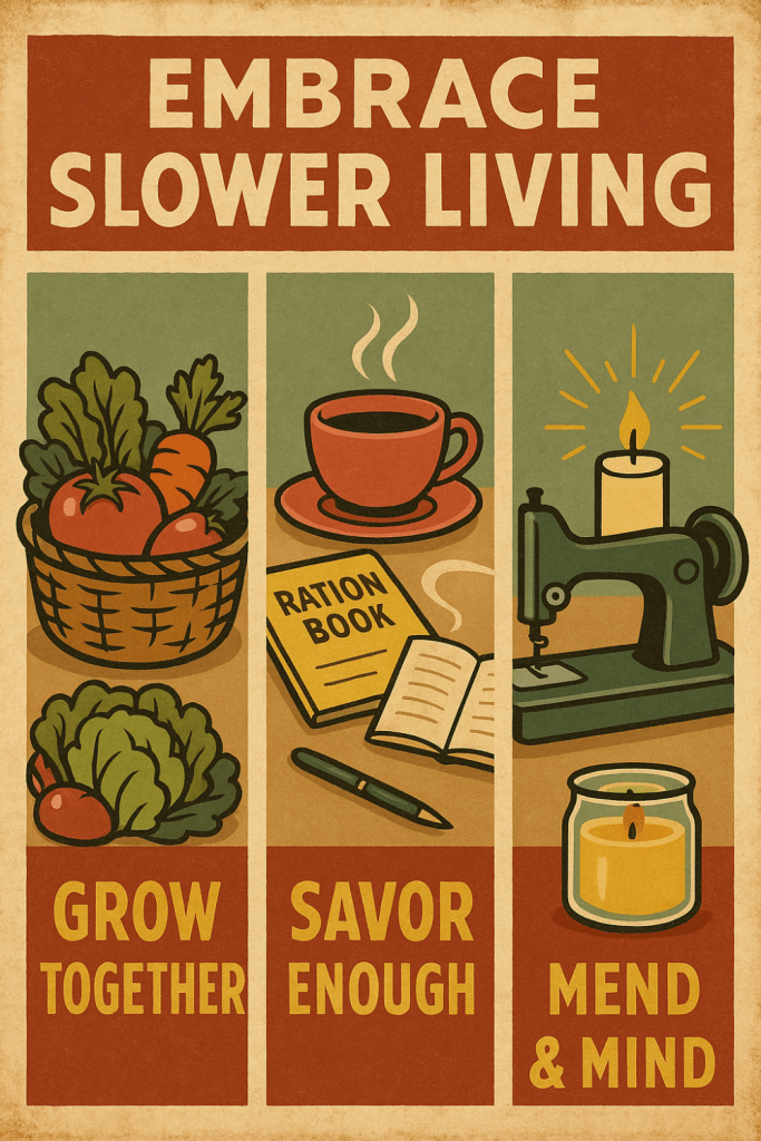 In many ways, the slower living movement of our time echoes the homefront life of the 1940s. While their world was shaped by ration books and Victory Gardens, ours is shaped by mindfulness journals and eco-conscious choices. Both share the same spirit: a longing to reconnect with essentials, to live within limits, and to find joy in what we already have.